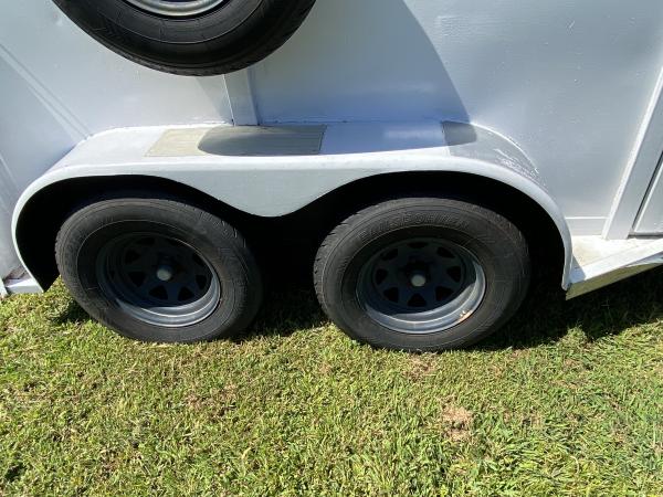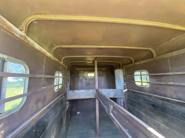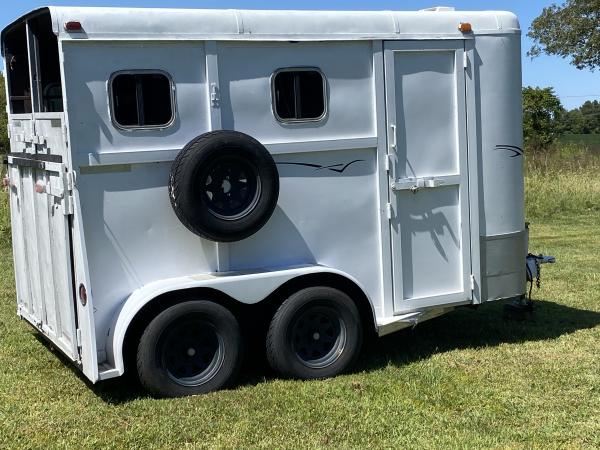Nice older 2 horse straight load 7 ft tall. Big trailer pulls perfect lights and tail lights work as should. Wired for 110 with plug and cord. Almost 5 new tires roof sealed 2 months no leaks. Steel trailer not aluminum no title bill of sale only. Nice unit that pulls great go anywhere. |