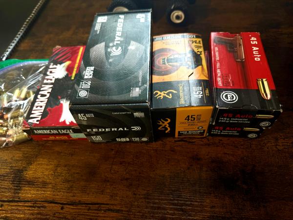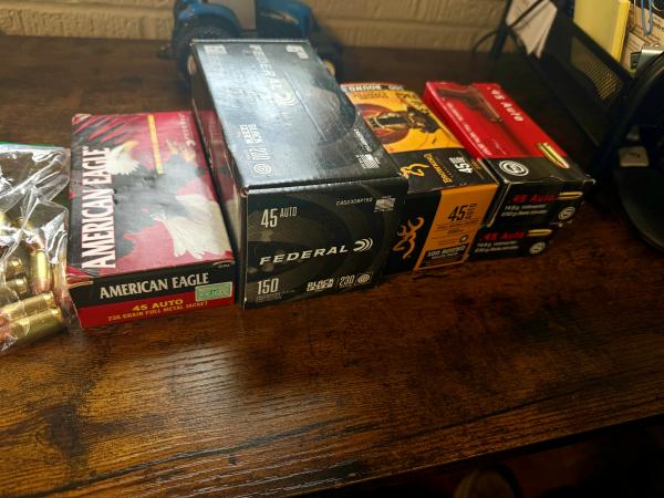 | I've sold my .45 1911s and have some .45 auto ammo leftover after the sales. $21 a box of 50. If you buy all 400 rounds for $165.00, I'll throw in a bag of mixed ball ammo and hollow point (+- 20rounds). |