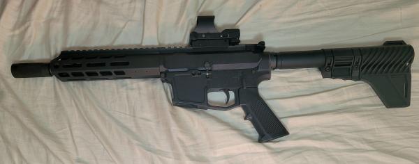 | This is a New Frontier AR9 pistol, in good condition with little use. About 7 inch barrel with blast diverter, picatinny rail on top and 7 inch m-lok hand guard, accepts Glock magazines. A compact package, great for a truck gun or home defense. Comes with a red dot and 33 round Glock magazine. Asking for $650, interested in CZP10C or P10F(optics ready versions only), Ruger RxM, 12 gauge Mossberg, or 5.56 ARs. Can send more photos, text only at (86 three) - 510 - 75 nine 0 |