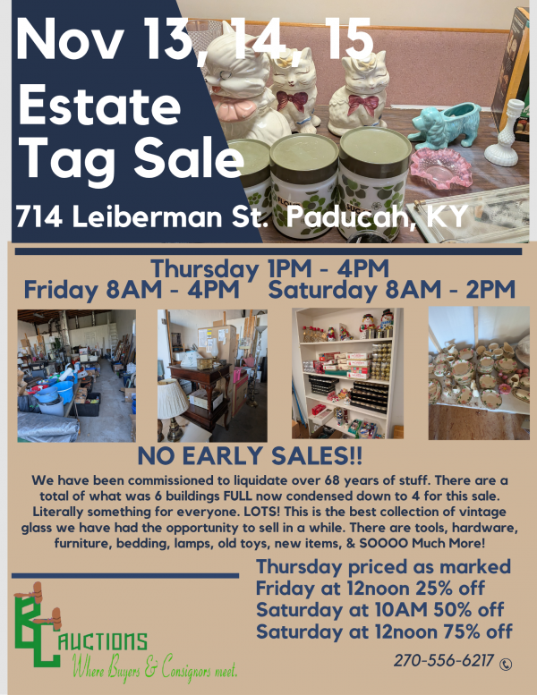 | HUGE SALE! Thursday Nov 13 - Saturday Nov 15 4 buildings full. 714 Leiberman St. Paducah, KY We have been commissioned to liquidate over 68 years of stuff. There are a total of what was 6 buildings FULL now condensed down to 4 for this sale. Literally something for everyone. LOTS! This is the best collection of vintage glass we have had the opportunity to sell in a while. There are tools, hardware, furniture, bedding, lamps, old toys, new items, & SOOOO Much More! Thursday 1PM - 4PM Friday 8AM - 4PM Saturday 8AM - 2PM NO EARLY SALES! Thursday priced as marked Friday at 12noon 25% off Saturday at 10AM 50% off Saturday at 12noon 75% off |