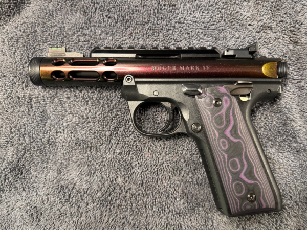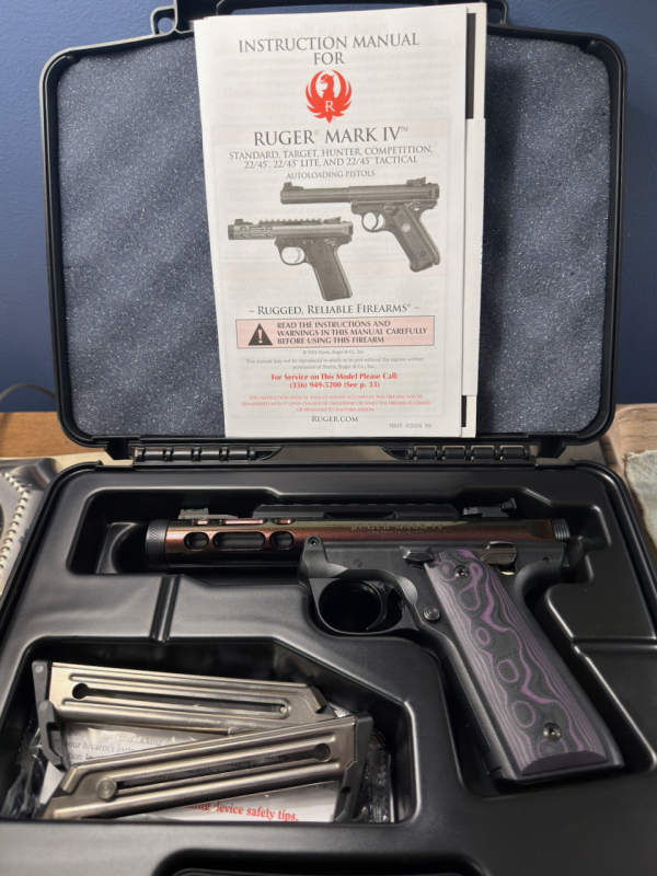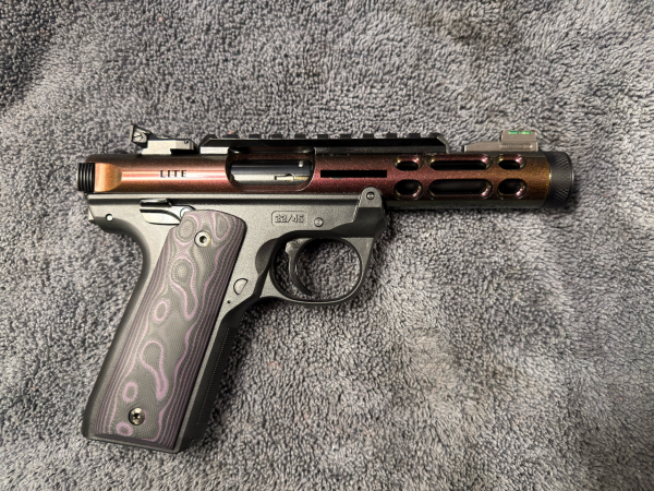 | Used, special edition Ruger Mark IV Lite .22LR pistol in Gun Candy Purple. In excellent condition. In the original hard case with three 10rd magazines. Also has threaded barrel and G10 grips. Front sight upgraded to a Hi Viz fiber optic. Somewhere around 400rds through it. Asking $510 No trades, please. Call or text (270) 217-5682 |
