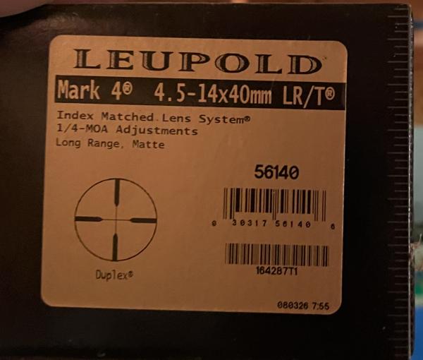 | Leupold mark 4 4.5-14x40 lr/t 30mm tube $750 Jerry lightly used. Never hunted with |