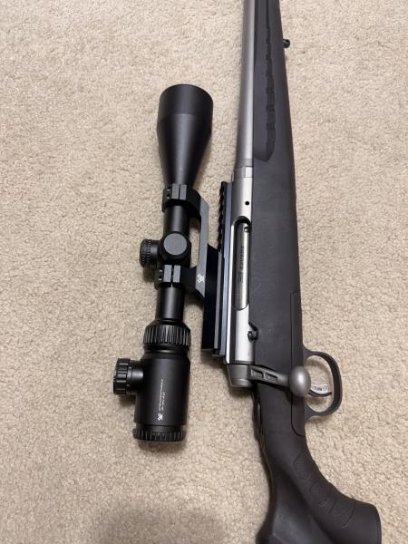 | Brand new Savage Axis 2 Stainless barrel - bought for the wife but it kicks too hard for her. only been shot 8 times. been in the closet ever since. As shown has Vortex mount and a Vortex 3x9x50 Crossfire. Has red dot in the middle of the cross hairs with 12 light settings. The trigger has an awesome sweet trigger pull and can be adjusted. $550 OBO. Not serious please don't bother. Cash only and must pick up. Thanks for looking. Feel free to message me with any questions. |