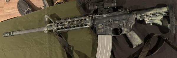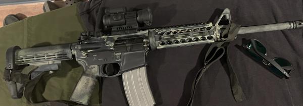 | New FN M4 5.56/.223. With a round count of exactly 40 rounds, this rifle is like new Despite its rattlecan paint job. It has been upgraded with a Midwest industries all metal MLOK rail. The paint could be citristriped off in about a minute. Sitting on top is a new Aimpoint pro. I’m looking to trade for a gen 5 Glock 19/17/45 plus a less expensive AR15 (aero/S&W/ bushmaster/springfield) If you only have a pistol or ar I’d accept one or the other plus cash. I’ve got about $1650 invested in this FN. Text whatcha got 2708368870 |