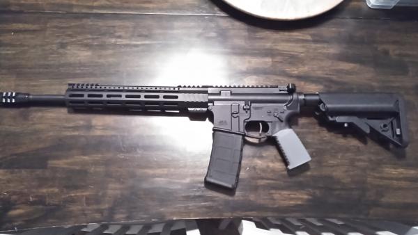 | Works great, lots of upgrades, 3.5 lb drop in trigger, ambi safety, rubber grip, ambi charging handle, sopmod stock, door crasher muzzle brake. |