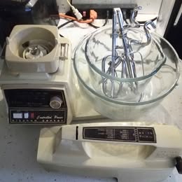 | I'm a novice at using these. This does work and runs good. As a first time user, I noticed two things. On the top it looks like it's missing the little plastic piece on the metal slide (see picture). You can use your finger to move it to where you want. Also the release button for the big piece to lift it up and down appears to be sticking unless I'm doing it wrong. It comes with two mixing glass bowls and four mixing pieces. Located in Gilbertsville. Text 270-206-2816 with a time to view/buy. |