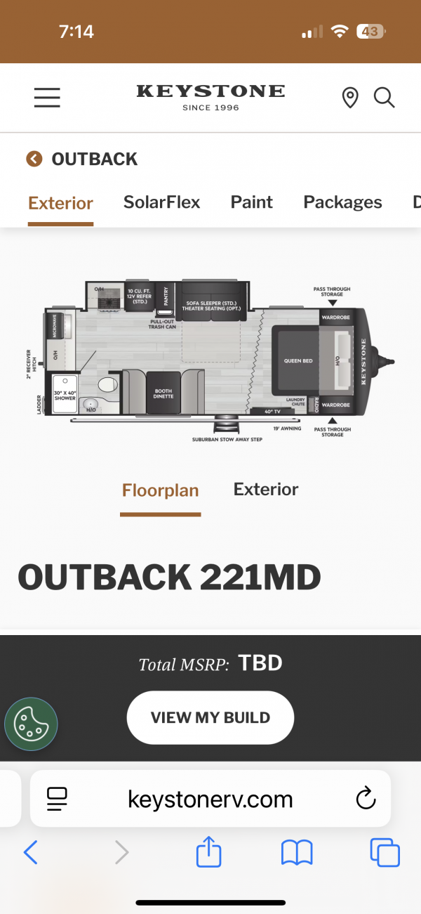 | Very nice and very well built 2021 Outback 221umd. Kept under roof almost all of the time when not being used since new. Easily towed with 1/2 ton truck or suv. In excellent condition. Comes with backup camera, weight stabilization hitch, Blackstone grill, retractable shower door, built in trash can, dirty clothes chute, queen bed, ceramic toilet and much more. 270-703-6154 |
