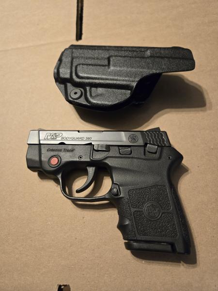 | S&W bodyguard 380 with built-in crimson trace laser. $325 Comes with IWB kydex holster, carry case, and extra magazine. I'll include the self-defense rounds I have as well. This pistol has less than 100 rounds through it. Some light wear marks in the finish on corners from pocket carry. The holster is brand new and worn once. Text preferred - 270-243-0728 |