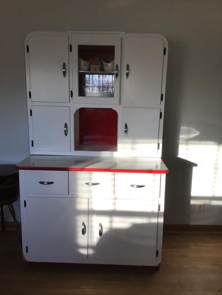 | Repainted Hoosier cabinet in original white and red colors. Still works and looks great. Call 270&703&2339 |