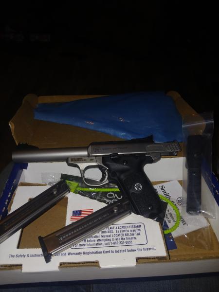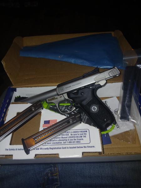 | Smith and wesson 22 victory with the heavy barell new in box unfired. Priced to sell quick, comes with picatinny rail, two ten round magazines, the gun lock and all the papers, and still has the plastic bag for the gun. Has some time of truglow style iron sights. First one with cash takes it home. 270-703-4732 |