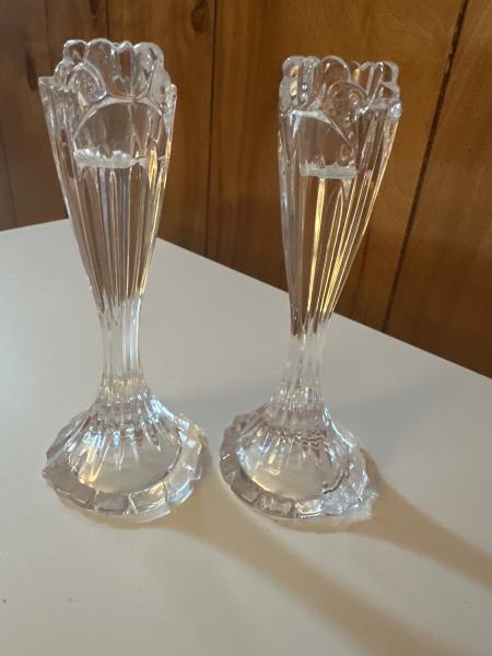 | 2 VINTAGE ONEIDA RIBBED CLEAR CRYSTAL CANDLESTICKS ART DECO STYLE 5.75" IN EXCELLENT CLEAN CONDITION. ASKING $25 TEXT 214-801-5119 FOR MORE INFORMATION |