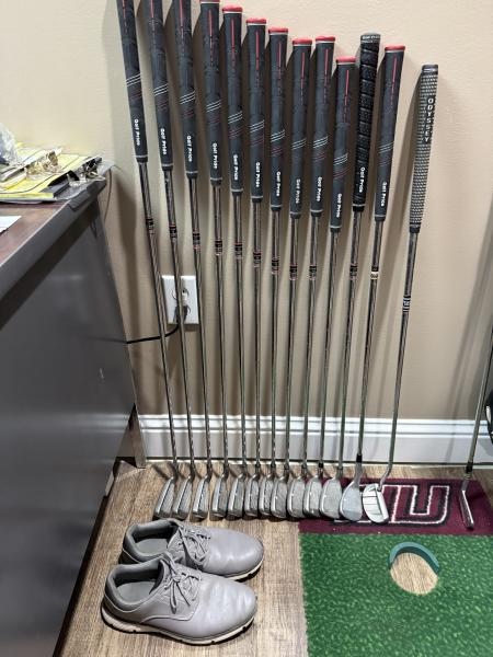 | Callaway Big Bertha-Full set of irons in great shape. 3-9 irons, PW, SW, GW, LW. Grips new last year. Memphis 10 steel shafts. These clubs are in Very good shape top to bottom! Also have a Titleist Vokey 60 degree and an Odyssey White Hot putter and a pair of Callaway golf shoes in 9.5 that are in good shape as well. Can throw in a sleeve of balls if that helps get you to the golf course. Call or text to 260-206-1581 |