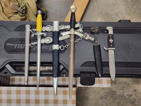 | For sale: German army and luftwaffe daggers. Also youth knife. These are replicas. They make a pretty display or can fill a spot until authentic pieces are aquired. In very good condition. Asking $75 each or $200 for all, OBO. Message me for more pictures or questions. Thank you. 270-519-8892 thomlitt2@aol.com |