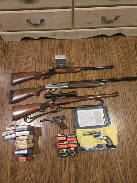 | 270-519-0348, TRADE OR SELL AS NEW RUGER #1 458 WIN MAG AND 1 BOX OF 458 AMMO,FRANCHI 1-12 DIAMOND DELUXE INERTIA 12GUAGE 28" SCREW IN CHOKE BARREL, RUGER MANLICKER STOCK 22-250 TANG SAFETY RED PAD, RUGER 327 FEDERAL MAGNUM SINGLE SEVEN WITH 6 BOXES OF AMMO AS NEW IN THE BOX,COLT HUNTSMAN 22LR,3 BOXES OF SUPER X 30-40 180 GR ,2 BOXES OF 300 WEATHERBY MAG.AMMO,1 BOX OF HORNADAY 257 ROB +P 117 AMMO,1 BOX OF NOSLER COUSTOM 300H&H AMMO,1 BOX OF RIFLE LINE 7MM MAUSER 139 GR AMMO |