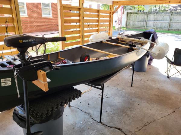 | 2020 Old Town Penobscot 17’6” Canoe. Made in the USA via LL Bean. 30 lb. thrust Minn Kota Endura motor, (stock prop & custom props included). Motor mount, Chins 12.8v 100 AH 1280WH LiFePo4 Deep Cycle Battery with protective box. Life jackets & throwable included, Wind Paddle Sail rig, Paddles, Outriggers (extremely stable for standing or fishing), anchor, lines & other gear included. Rowing rig included. (No trailer). Canoe is registered & current. Covered & stored indoors. $1,400. |