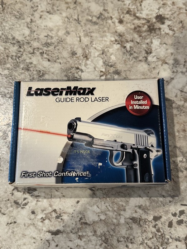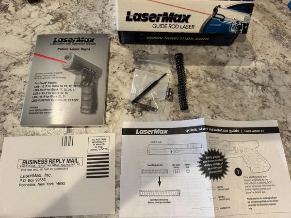 | Brand new old stock green laser. Complete. I just now finally opened it for the pictures. Save $150. Simply remove your Glock 20/21 Gen 1, Gen 2, or Gen 3 guide rod, drop this one in and you have an integrated laser with no exterior bulk. It will come with new batteries and new spare batteries since these are new old stock. Located in Symsonia. FitsG20/G21 Gens 1-2-3 pistols with finger grooves and rail. Does not fit Gen 4 or 5. TEXT: 27 zero 2 ten 4480 |
