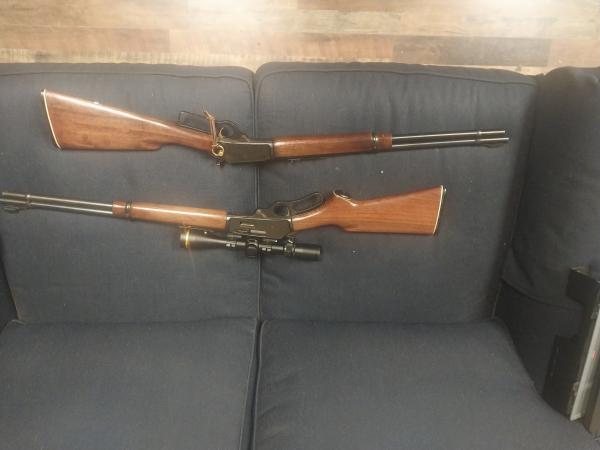 | 1st,-Marlin 1894 1870-1970 anniversary 44 magnum,saddle ring,very nice 1970 made gun--1100.00. 2nd -1978 marlin 336 jm stamped 30-30 with Leopold vx-3 with 4.5x14x40 scope. Very nice --700.00. Trades considered text 270-207-1498. If call leave voicemail not good pics |
