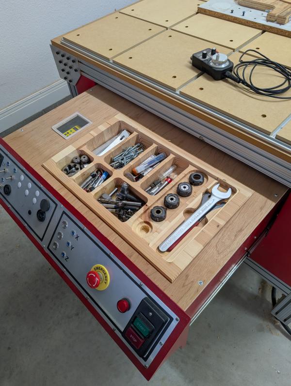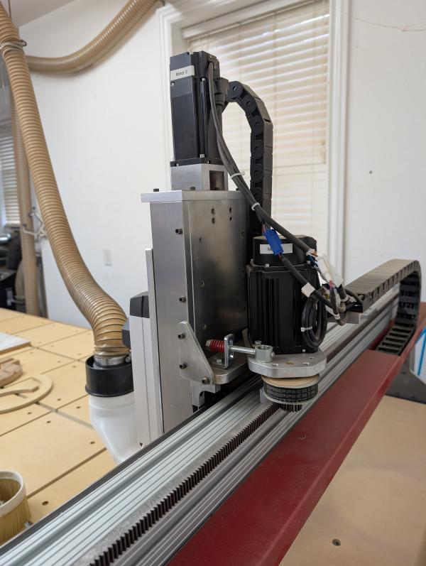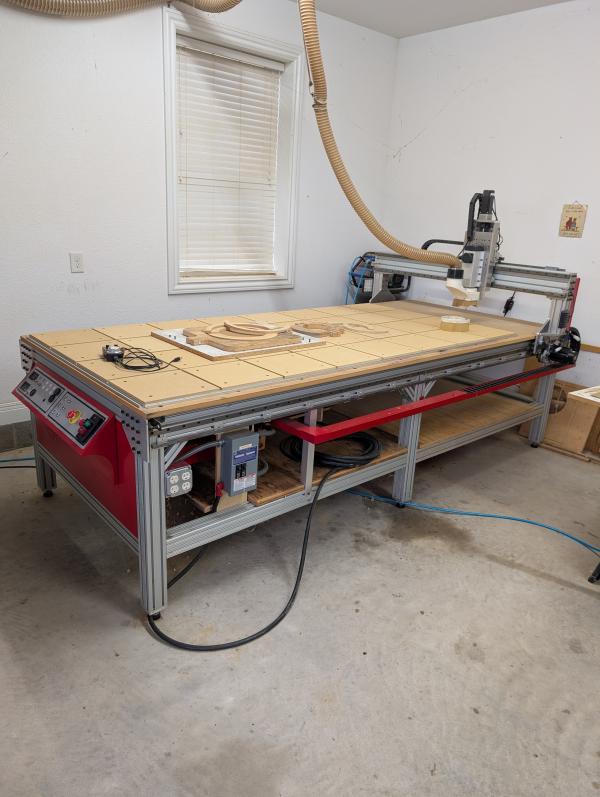 | CNC for hobby or commercial use. Ideal for medium to large cabinet shop. Extra space at the rear for tool bank. Electronics can be configured to suit your needs. Vacuum system included either controlled manually or with software. 4 hp spindle. Nema 34 drive motors. Z height 7 1/2 to 8". LED lighting. Lots of tooling and jigs. New spoil board. Hold down T slot tracts 12" both ways. Electrical outlets both sides. Cash only |