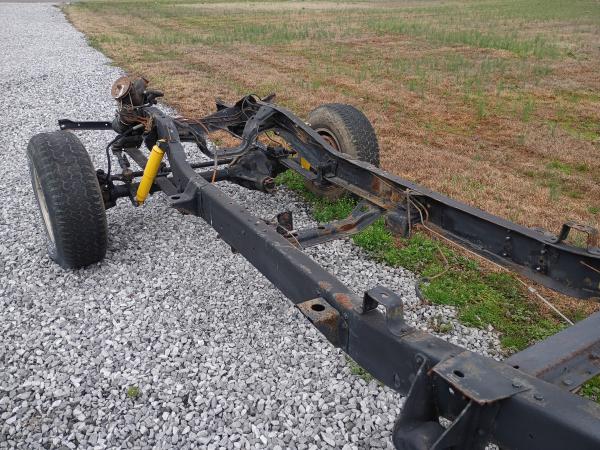 | 115" (swb) chevy 4x4 pickup truck chassis. Was a lwb and has been cut down. Good axles and springs, new shocks,hard to find bumper brackets. PS pump and brackets. I dont know the gear ratio but it was a granny low 4 spd 307 truck from the factory. Call or text 270 nine nine 4 3 five 0 one before 9 pm please |
