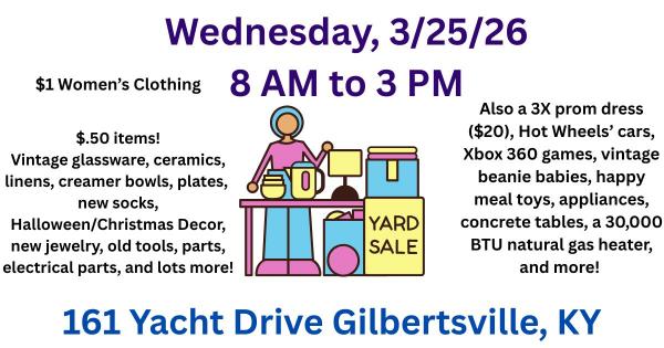 | Yard Sale from 8 AM to 3 PM Wednesday, 3/25/26 161 Yacht Drive Gilbertsville, KY Mostly fifty cent items from vintages to new socks to new jewelry. But also have a TV for sale, two concrete tables with benches, a 30,000 BTU heater, XBox one and Xbox 360 games and other stuff. Also $1 women's clothing. |