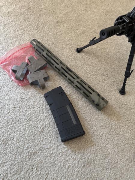 | PSA AR10 Battle worn look. Less than 100 rounds put through it. 18" stainless steel barrel. Ambidextrous safety. One 20 round mag and one 10 round mag. Magpul mag pulls. Extra forearm. All new Magpul furniture and Magpul sling and adaptors. Bipod tilts and swivels and locks in place. Legs go forward or rewards. Ambidextrous charging handle. Cash only and must pick up. Daniel Defense iron sights. Awesome rifle just don't shoot it. $1200 OBO. Feel free to come look at it. If need more pics just Pm me but don't waste my time. Thanks |