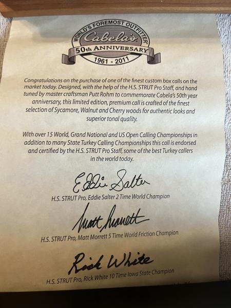 | Cabela’s/ hs strut 50 anniversary box call signed by Rick White and Eddie Salter |