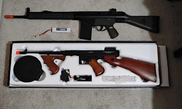 | they work well, have been tested recently. would sell both for $300, or individual for the price below, The Thompson comes with an 8.4v Battery and a charger, and the G3 comes with a 9.6v Battery and no charger. I WOULD NOT RECOMMEND FOR A CHILD UNDER 16, I WOULD RECOMMEND GETTING ANSI Z87.1 GLASSES FOR SAFETY, THESE HAVE AN FPS RATING OF 300+ Cybergun Thompson Imitation Wood $165 JG T3-K3 (Stuck in Full Auto) $145 Open to trades, looking for a Cyma AK with wood or imitation wood. 270-349-1393 |