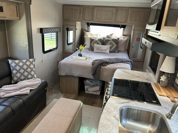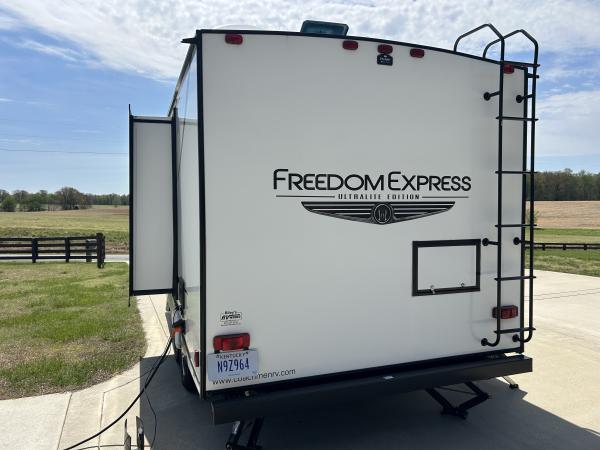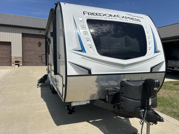 | 2021 Coachmen Freedom Express 192RBS up for sale. Beautiful condition. 22.5' overall length on two axles shod with new tires that have only about 500 miles on them. 1 slide, 12 volt refrigerator, aluminum frame, 2 propane tanks, entertainment center, comfortable queen bed with flanking mirrored clothes closets, power awning, blackout blinds, huge front window with privacy glass, just an all around well designed camper with too many great features to be able to list all. Will include all needed hoses, an equalizer anti-sway hitch, and can leave most anything you may need to get camping! Needs nothing. Come see it! Clear title in hand. Hurry! Thank you for looking. |