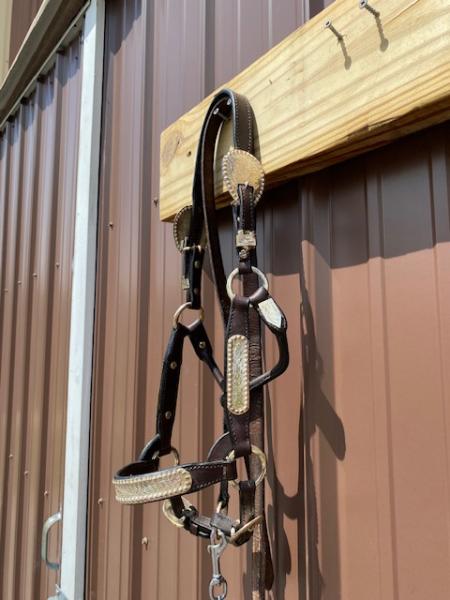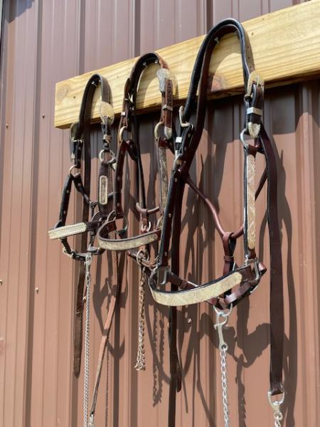 | Horses sold - show equipment for sale ! Here are 3 silver show halters - smaller ones will also fit ponies! #1 Horse weanling OR pony - cheek pieces 6" - $25.00. #2 horse yearling OR pony - cheek pieces7 1/2" - $30.00. #3 Adult horse - cheek pieces 8 1/2" - $35.00. Contact me for photo of #3 adult size close up (only 3 photos allowed - see adult halter on right in group photo). All come with lead lines - medium halter lead line has replacement snap. See photos! Cash only please. |