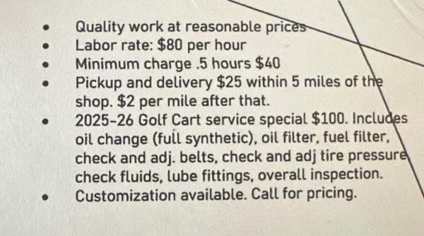 | Golf cart service and repair for reasonable prices. See picture for pricing. |
