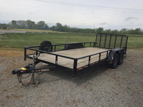 | Used 82”x 18’ Utility, dove, 3’reinforced gate, 3500lb axles, brake, pressure treated foor, like new radial tires on 15” rims, spare tire on rim, LED lights, 2”ball hitch, jack that is set back. This trailer was originally sold by us! Have title. |